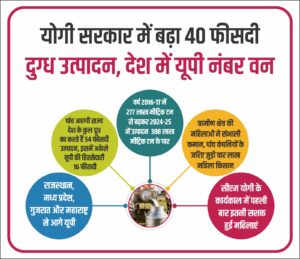 सीएम योगी के कार्यकाल में दुग्ध उत्पादन में जबरदस्त उछाल दर्ज हुआ है। वर्ष 2016-17 में जहां उत्पादन 277 लाख मीट्रिक टन था, वहीं वर्ष 2024-25 में यह बढ़कर 388 लाख मीट्रिक टन के पार पहुंच गया है।