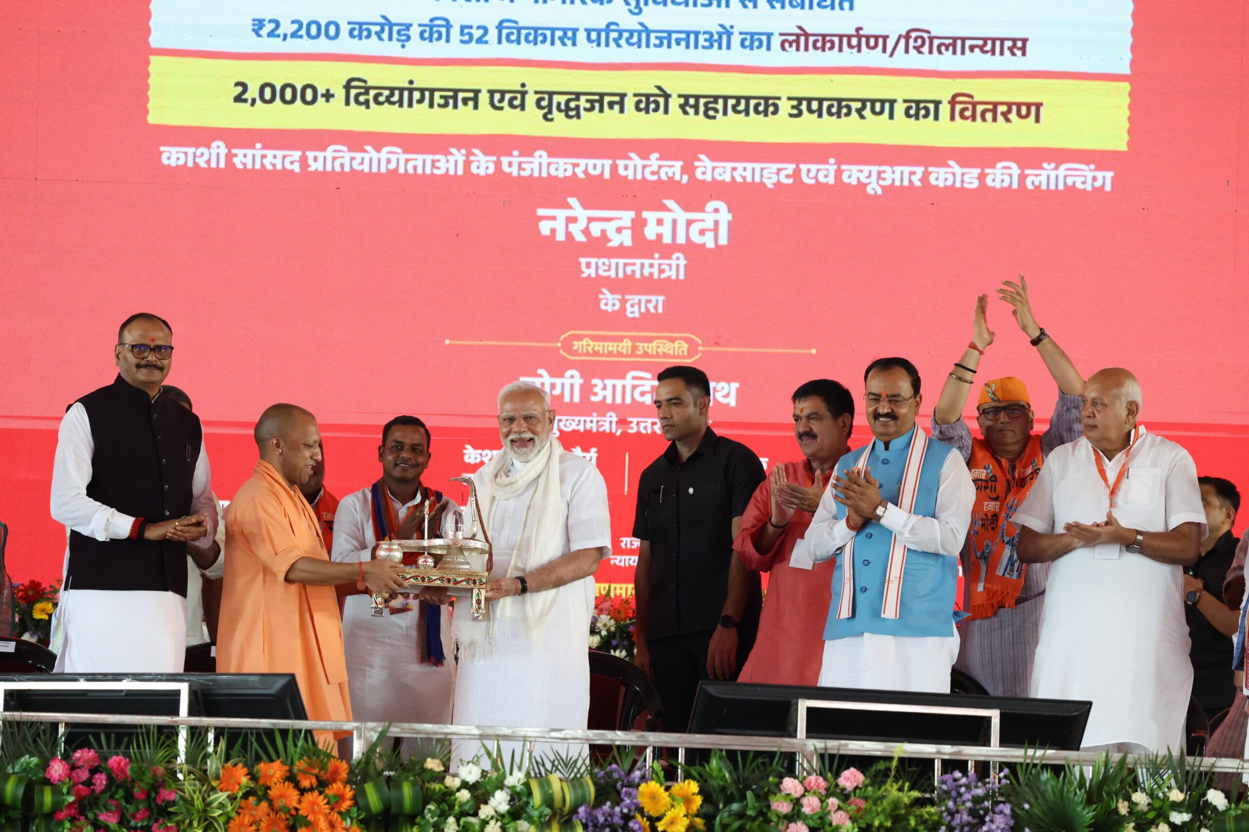 वाराणसी, 02 अगस्त। श्रावण मास के पावन अवसर पर शनिवार को काशी पहुंचे वाराणसी के सांसद और देश के प्रधानमंत्री नरेंद्र मोदी को उत्तर प्रदेश के मुख्यमंत्री योगी आदित्यनाथ द्वारा जी.आई. रजिस्टर्ड बनारस मेटल रिपोंसी क्राफ्ट से निर्मित अनूठी कलाकृति भेंट की गई। इस शिल्प में काशी के तीन जी.आई. क्राफ्ट्स, जिसमें मेटल रिपोंसी क्राफ्ट, मीनाकारी और मेटल कास्टिंग क्राफ्ट का अद्भुत समन्वय देखने को मिला।