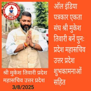 भारत के अनेक राज्यों से पदाधिकारियों का चयन किया गया l उत्तर प्रदेश से चयनित प्रदेश महासचिव मुकेश कुमार तिवारी  ने कहा कि संगठन के शीर्ष पदाधिकारियों द्वारा दिए गए दायित्व का निर्वाहन पूरी निष्ठा एवं ईमानदारी के साथ करेंगे l संगठन को मजबूत और विस्तार करने में  सहायक बनेंगे l संगठन से जुड़े पत्रकारों को संगठन के नियमों का कड़ाई से पालन करने और सच्ची पत्रकारिता पूरी ईमानदारी के साथ करने को कहा l संगठन के संस्थापक जी एवं राष्ट्रीय अध्यक्ष जी का एवं शीर्ष पदाधिकारियों एवं सभी पत्रकार साथियो एवं सदस्य गणों का धन्यवाद आभार व्यक्त किया और उत्तर प्रदेश के पुनः बने प्रदेश महासचिव को ऑल इंडिया पत्रकार एकता संघ के सैकड़ो सदस्यों ने बधाई दी l नवनियुक्त चयनित पदाधिकारियों का विवरण इस प्रकार से किया गया है l छत्तीसगढ़ से युवराज सेन्द्रे प्रदेश अध्यक्ष जनार्दन प्रसाद साहू प्रदेश उपाध्यक्ष , डॉ ईश्वर लाल सिन्हा प्रदेश महामंत्री जैनेंद्र कुमार महिला विधिक सलाहकार , कांकेर छत्तीसगढ़  से  गौतम निषाद तहसील अध्यक्ष कोयली बेड़ा, एवं गुजरात अहमदाबाद से साधना ओझा मंडल वरिष्ठ उपाध्यक्ष  उत्तर प्रदेश से  मुकेश कुमार तिवारी प्रदेश महासचिव,  यूपी बरेली से वेद प्रकाश प्रजापति प्रदेश सचिव उत्तर प्रदेश, प्रतीक गुप्ता जिला संगठन मंत्री शाहजहांपुर, नरेंद्र सोलंकी सिंह सोलंकी जिला अध्यक्ष आगरा, नवीन गुप्ता सचिव आगरा मंडल, प्रताप सिंह आजाद जिला उपाध्यक्ष आगरा , राहुल श्रीवास्तव जिला महासचिव आनंद कुमार वरिष्ठ जिला उपाध्यक्ष नीलम जादौन महिला प्रकोष्ठ जिला प्रभारी आगरा अमरेश नाथ जिला सचिव आगरा, जसवीर सिंह जिला कार्यकारिणी सदस्य आगरा ,अभिषेक शर्मा जिला उपाध्यक्ष आगरा ,विशुन सिंह चौहान जिला कोषाध्यक्ष आगरा ,शिवम सिंह जौनपुर उत्तर प्रदेश विधिक सलाहकार, शाहजहांपुर से शोभा रानी जिला सचिव अमित कुमार जिला उपाध्यक्ष जौनपुर से इंद्रेश यादव  जिला सचिव आशुतोष तिवारी जिला महामंत्री कानपुर पुष्पेंद्र सिंह सदस्य सुल्तानपुर सीताराम मिश्रा सदस्य इलाहाबाद अनुप कुमार सिंह जिला सचिव, वाराणसी चुम्मन लाल साहू जिला अध्यक्ष संतोष कुमार सदस्य जौनपुर पंजाब से मीनाक्षी शर्मा महिला प्रकोष्ठ प्रदेश सचिव  हिमाचल प्रदेश सुभाष चंद चंदेल वरिष्ठ प्रदेश उपाध्यक्ष  आदि पदाधिकारी की नियुक्ति की गई वही समस्त राष्ट्रीय प्रदेश पदाधिकारी ने सभी नवनियुक्त पदाधिकारीयों को शुभकामनाएं देते हुए संगठित परिवार के उज्जवल भविष्य के लिए ईश्वर से कामना की l