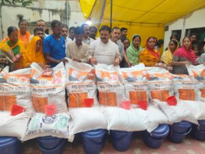 बाढ़ प्रभावितों को राहत सामग्री के साथ मिष्ठान वितरण भी किया