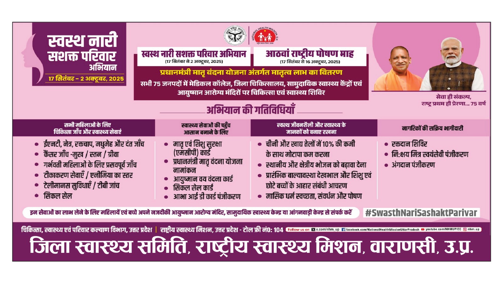 “स्वस्थ नारी, सशक्त परिवार अभियान का राष्ट्रीय शुभारम्भ 17 सितम्बर 2025 को माननीय प्रधानमंत्री जी द्वारा मध्य प्रदेश में आयोजित कार्यक्रम में किया जा रहा है। इस अभियान के राष्ट्रीय स्तर पर शुभारम्भ के साथ-साथ प्रदेश में इसका वर्चुअल शुभारम्भ भी किया जा रहा है। राष्ट्रीय कार्यक्रम का सीधा प्रसारण और वेबकास्ट राज्य, जिला, जिला अस्पताल, सामुदायिक स्वास्थ्य केन्द्र और आयुष्मान आरोग्य मंदिरों तक किया जा रहा है। जनपद, ब्लाक स्तरीय चिकित्सालयों ,आयुष्मान अरोग्य मंदिरों पर शुभारम्भ कार्यक्रम उसी स्थान पर आयोजित किया जाएगा जहाँ इसके बाद स्वास्थ्य शिविर लगाया जाएगा। स्वास्थ्य सेवाएँ उपलब्ध कराने हेतु हेल्थ कियोस्क / स्टॉल्स लगाए जा रहे हैं।