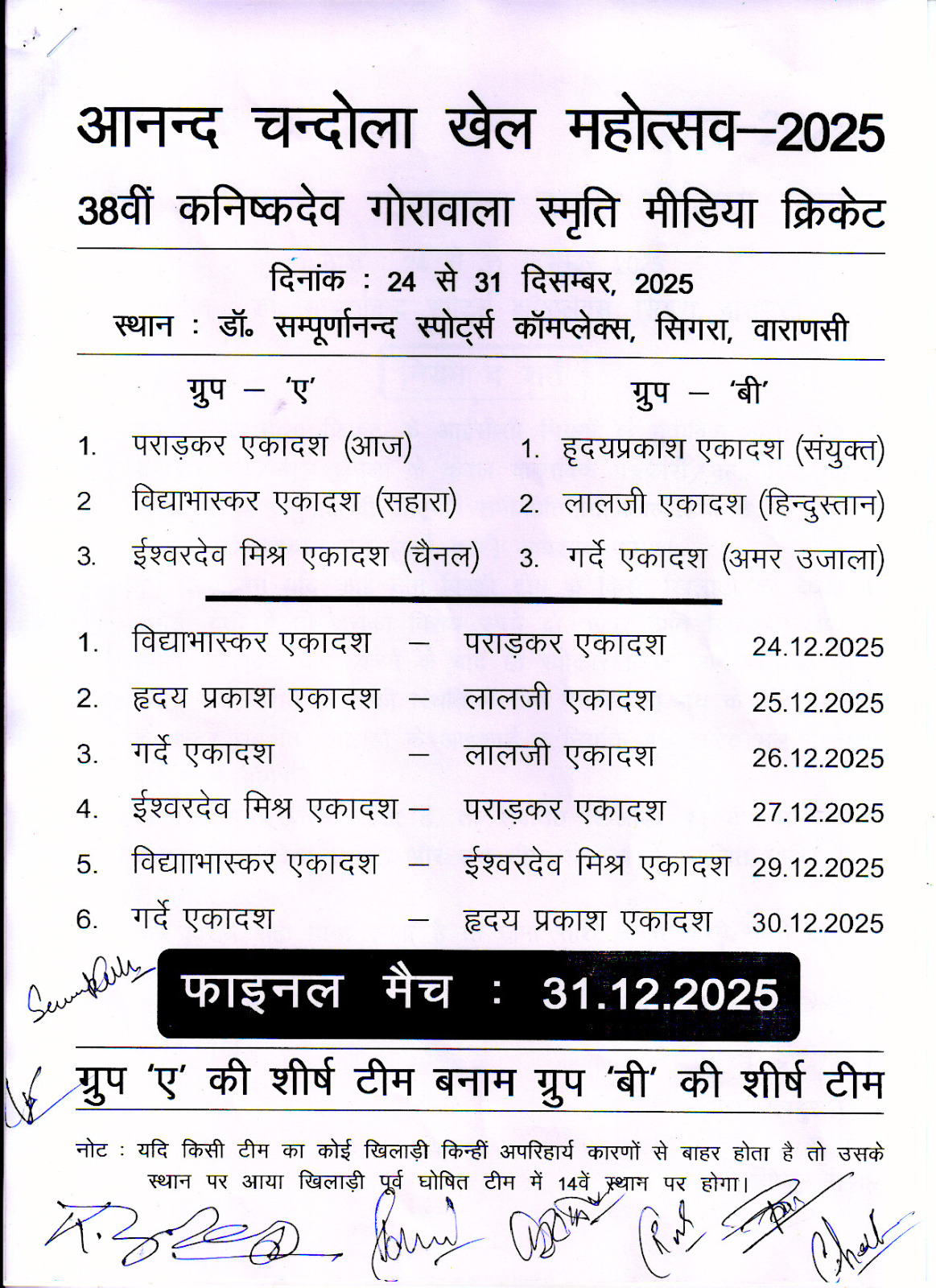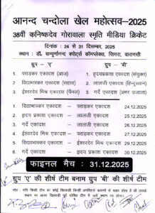 वाराणसी। काशी पत्रकार संघ से संचालित वाराणसी प्रेस क्लब के तत्वावधान में डॉक्टर संपूर्णानंद स्पोर्ट्स कांप्लेक्स में 24 दिसंबर 2025 से 38वीं कनिष्कदेव गोरावाला स्मृति मीडिया क्रिकेट प्रतियोगिता का आयोजन किया गया है।