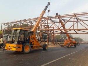 हाईवे पर फुट ओवर ब्रिज निर्माण कार्य के दौरान दो घंटा वाहनों का आवागमन रहा बाधित
