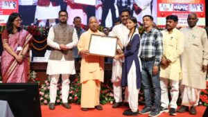 (मुख्यमंत्री योगी के हाथों छात्रवृत्ति प्रमाणपत्र प्राप्त विद्यार्थी)
